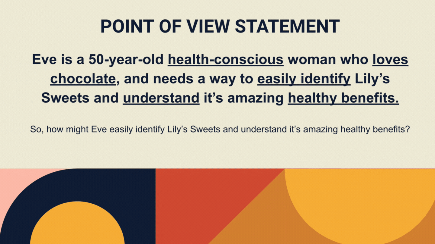 From these insights, we were able to craft the following point of view statement: Eve is a 50-year-old health-conscious woman who loves chocolate, and needs a way to easily identify Lily’s Sweets and understand its amazing healthy benefits.