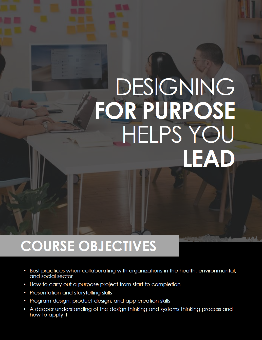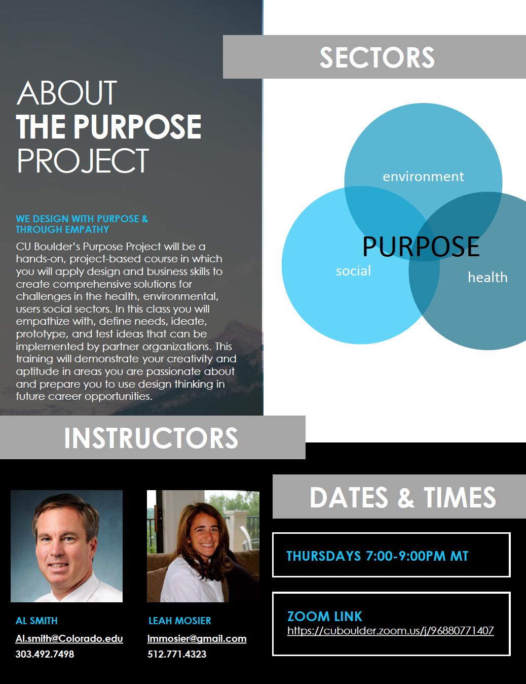 I designed a course called the Purpose Project, which consisted of 20 interactive design thinking workshops for CU Boulder Sophomores. I was a lead instructor for this course and brought in a team of 6 facilitators to support the class. This course was an intensive, hands-on, project-based experience in which students applied design and business skills to create comprehensive solutions for challenges in the health, environmental, social sectors.