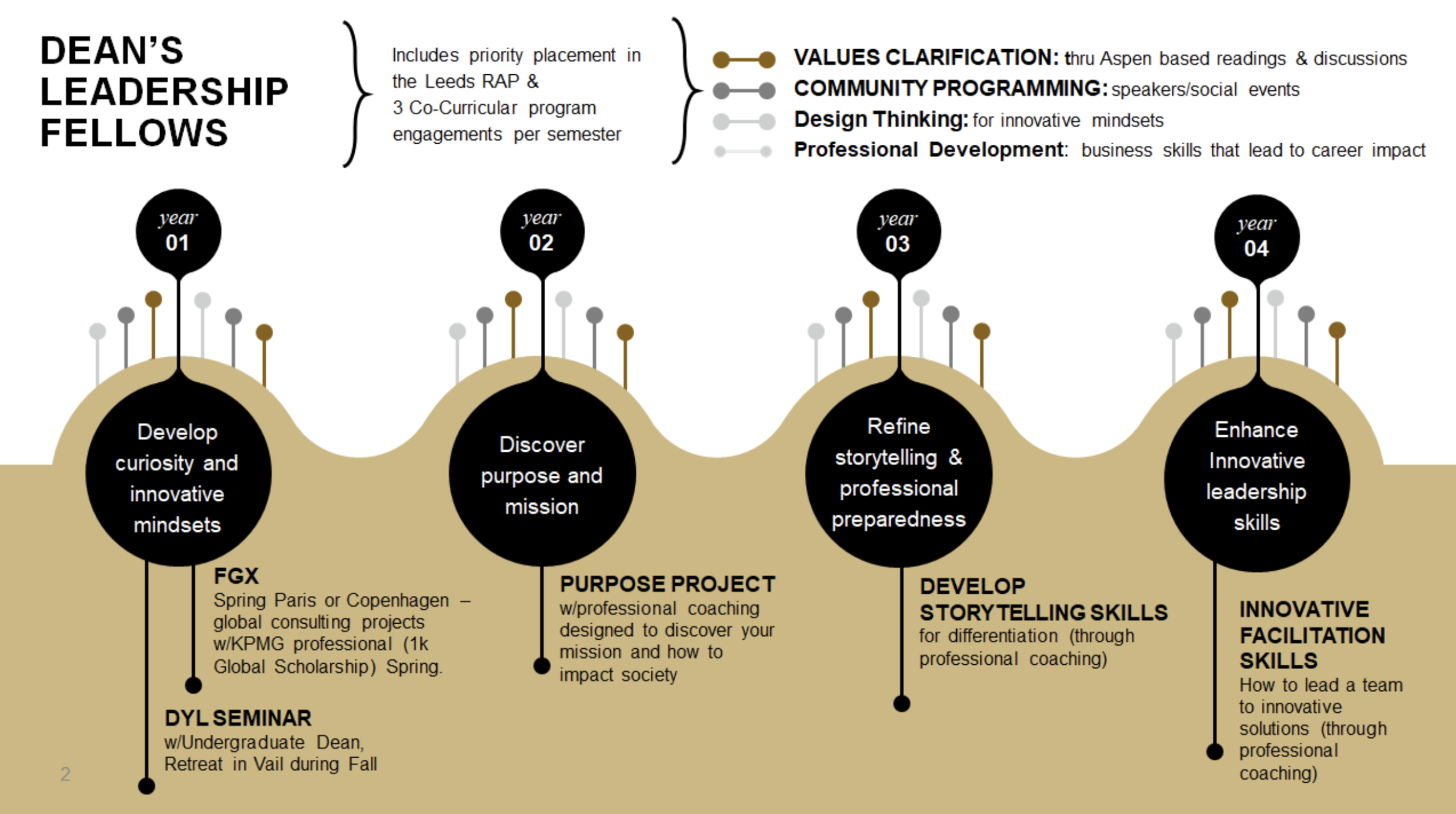 As the Chief Learning Officer for the CU Boulder’s Dean’s Leadership Fellows, I co-developed a design thinking leadership program for undergraduate students. This work involved creating a vision for the program that would allow students to grow over the course of their academic experience. To support this vision, I created interactive workshops for students in both in person and virtual settings, trained and managed a team of six facilitators, and developed tailored curriculum. Here’s an overview of the program: